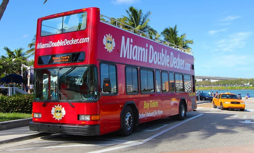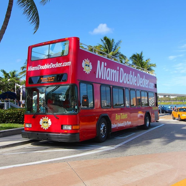 Tour of Miami and surrounding area on double-decker open top tour bus; bus stops along the way allowing passengers time to explore
