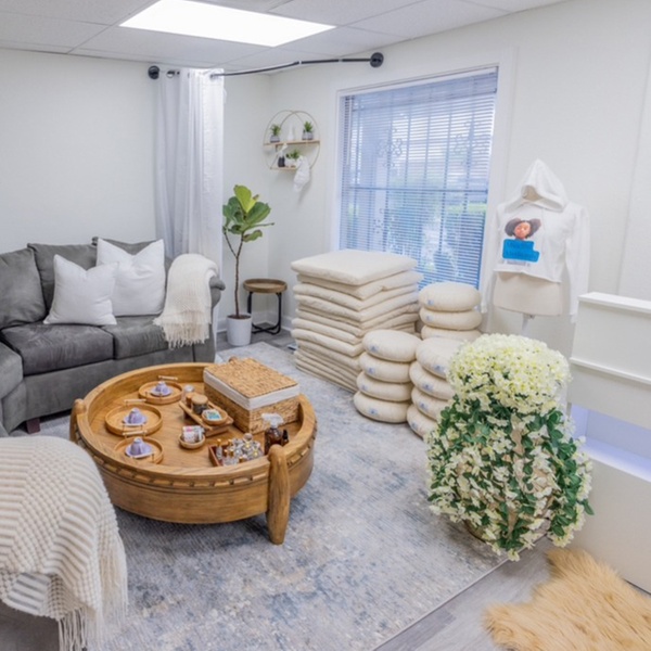 • Luxury event set up with linens, elevated lighting + backdrop for photos