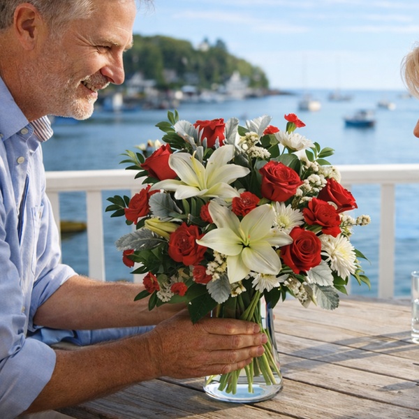 • Love Blooms Bouquet: A romantic and elegant arrangement featuring passionate red roses, pure white Asiatic lilies, red carnations, and white cushion spray chrysanthemums, all beautifully framed by dusty miller, white statice, huckleberry, and lemon leaf.
