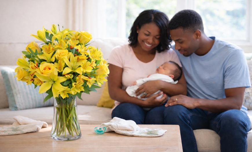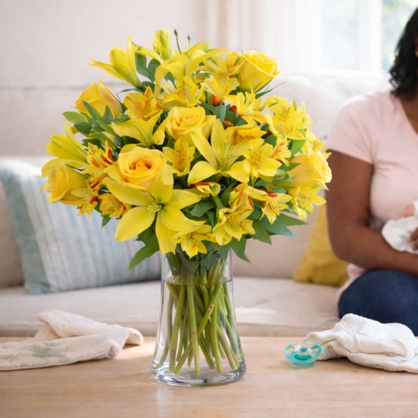 - Spirit of Sunshine Bouquet: A joyful arrangement of Pink Mini Carnations, Yellow Lilies, and White Daisy Poms to welcome the newest member if the family!