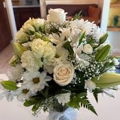 Eternal Blessings Bouquet: Designed with grace and purity, this all-white arrangement is a timeless tribute, conveying sincere condolences and offering a soothing presence to those who are grieving. Features White Roses, White Lilies, White Spider Mums, White Mini Carnations, and White Alstroeneria.
