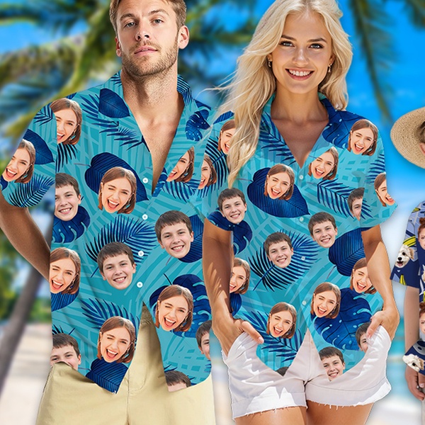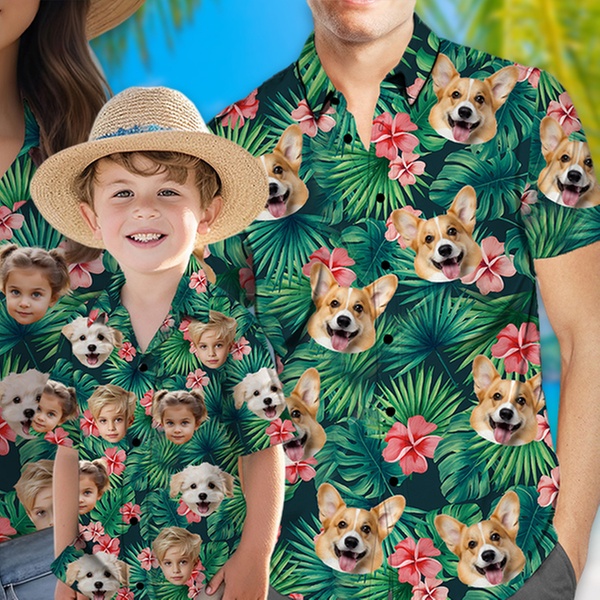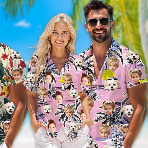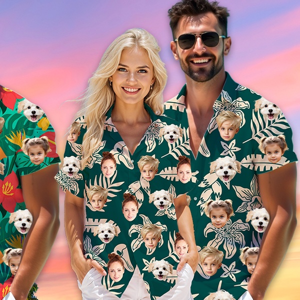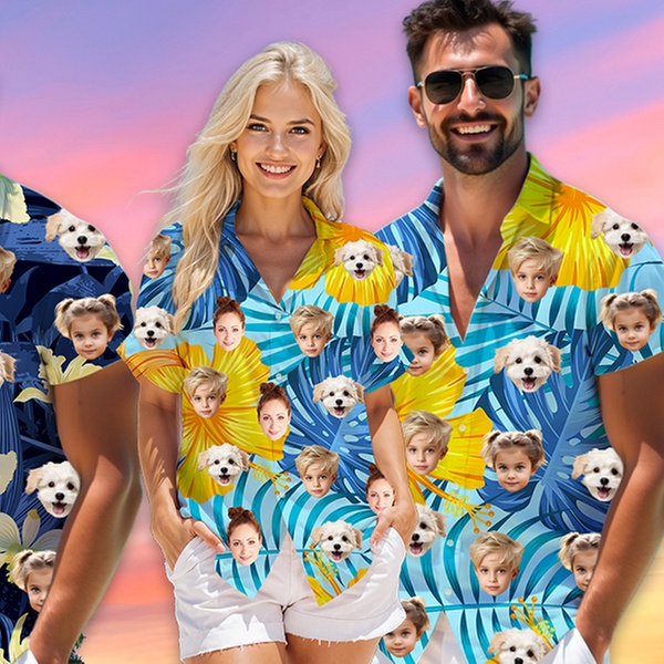 Get ready for your next vacation or party with fully customized Hawaiian shirts. Choose from over 80 vibrant tropical patterns and upload your favorite faces or pets to create unique apparel for the whole family - men, women, kids, and even your furry friends.
