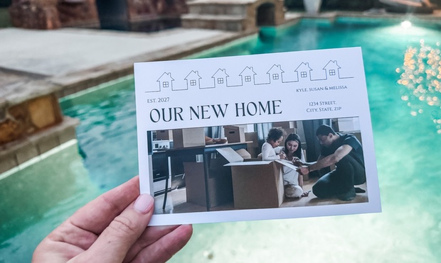 Create custom double-sided “Just Moved” cards with your new address and photos. Premium paper, envelopes included. 24–200 cards.
