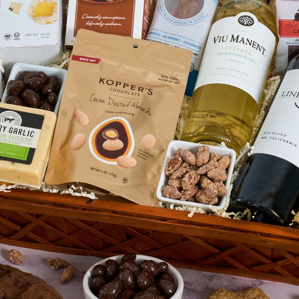 Wine Lovers Trio: Surprise your favorite wine lover with this elegant selection of sophisticated flavors! Inside a beautifully crafted basket, they will find a luxurious Excursion Red Blend, a velvety Mencia Roble, and a delightful Sauvignon Blanc from Viu Manent, all accompanied by a variety of delicious gourmet foods. This generous arrangement makes the perfect gift for any occasion.