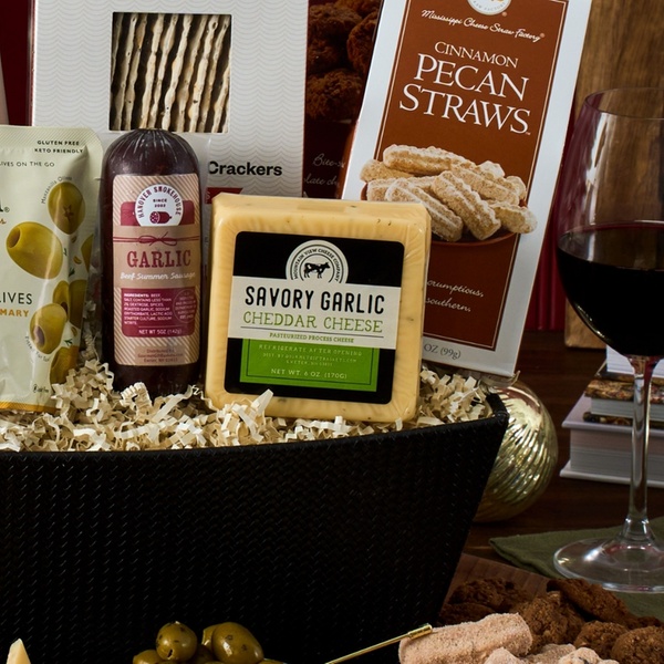 The Classic Red Wine Gift Basket is an ideal gift for any occasion, be it a birthday, anniversary, retirement, or congratulating someone on their new home. The basket includes a full-bodied dark red Cabernet with delicious fruity notes and vanilla spice. We have paired this excellent wine with gourmet snacks that perfectly complement it, such as creamy cheese, spicy sausage, and delicious cookies. You can make someone's celebration even more special by gifting this basket. So, order now and let us deliver it to their doorstep!