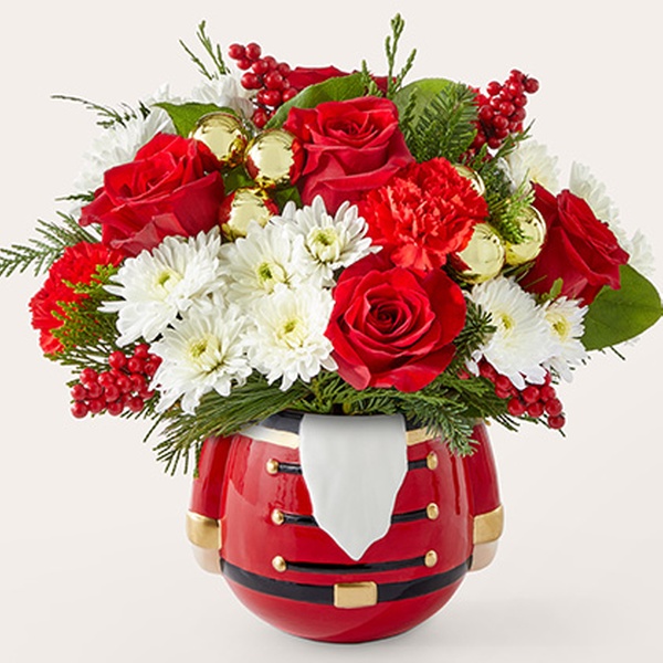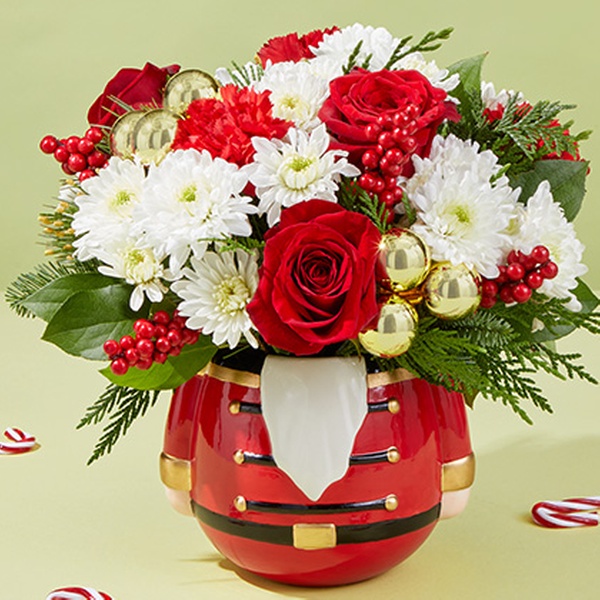 • Merry Magic Nutcracker: Share in the nostalgia of the season with a collectable nutcracker vase perfectly accented with holiday blooms. Includes a vibrant variety of Carnations, Roses, and Christmas Greens.