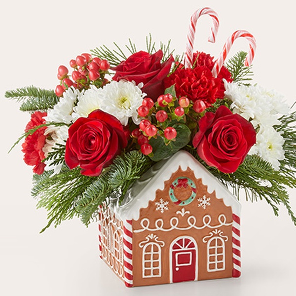 • Gingerbread Bakery Bouquet: Share warmth and love with the Gingerbread Bakery Bouquet, a delectable blend of white and red stems, sure to have you dreaming of cinnamon, nutmeg and cloves. Featuring Carnations, Roses, Hypericum Berries, and Christmas Greens.