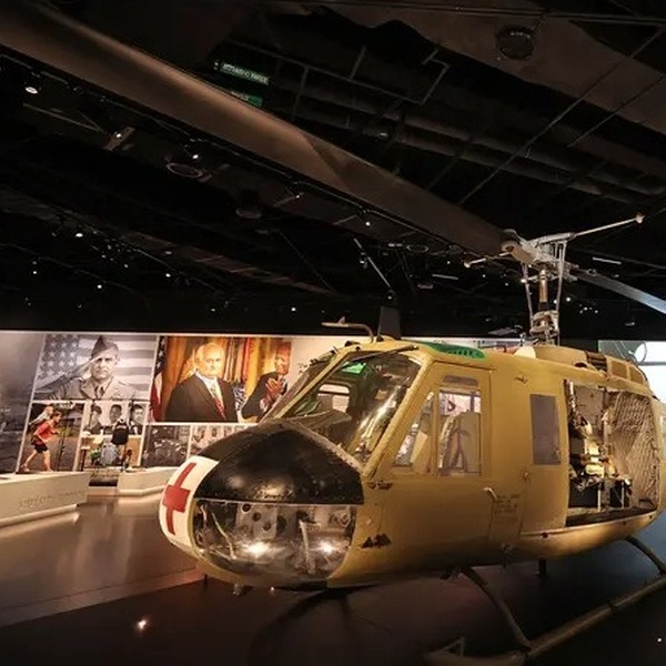 The Museum features 31,000 square feet of interactive exhibits, including "Moments of Action," "More Than a Medal," and "From Rails to Rotors," which includes a fully-restored Huey helicopter.