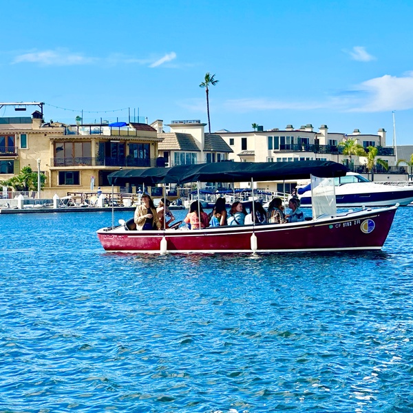 Up to 8 or 12 passengers can lounge beneath the canopy of a rechargeable, emission-free electric boat as it putters quietly across Newport Harbor