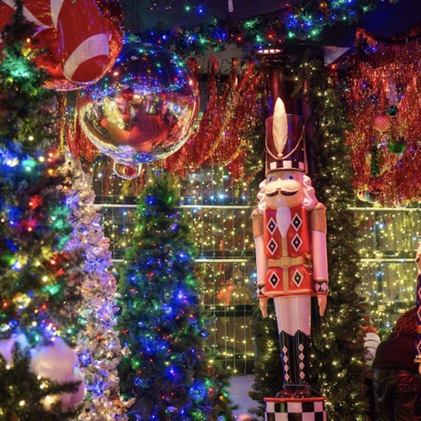 An incredibly festive and immersive atmosphere, with over-the-top holiday decorations covering every surface from tinsel to ornaments.