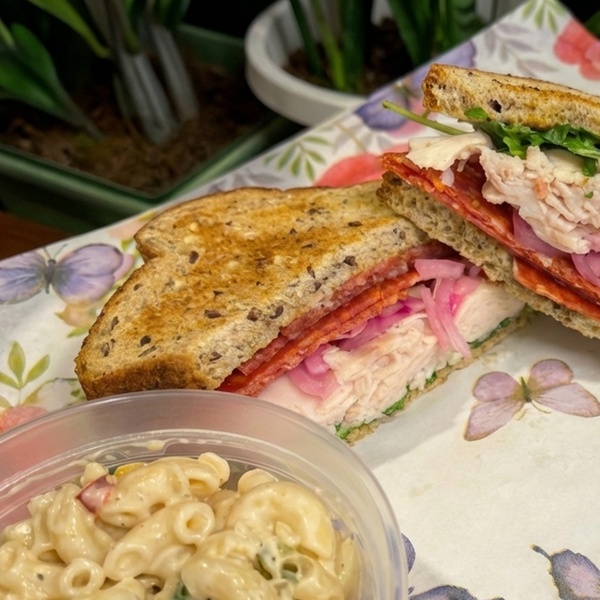 - Sandwich: Oven-kissed turkey breast, savory pepperoni, pepper jack cheese, house pickled onions, leafy arugula, house-made jalapeño ranch on multigrain bread