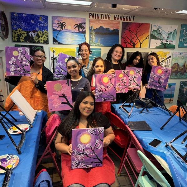 At Painting HangOut, you'll enjoy a warm, welcoming studio environment where an experienced instructor guides you step-by-step through creating a featured painting. It's a fun, relaxing, and social experience perfect for all skill levels.