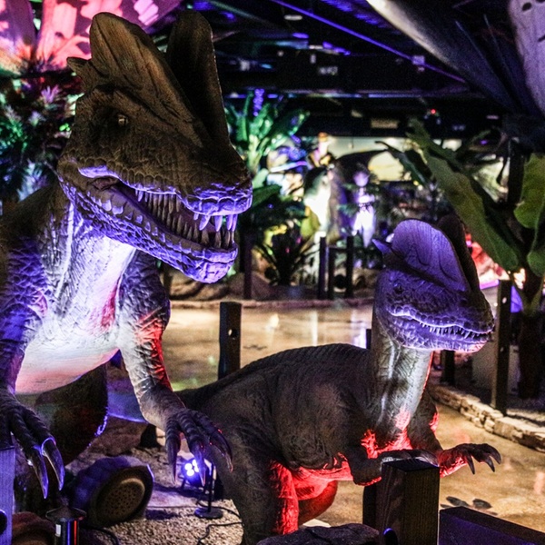 Pangaea Land of the Dinosaurs takes guests on a journey back to the Mesozoic Era through numerous interactive exhibits and educational stations. The indoor center features more than 50 life-sized animatronic dinosaurs, including the velociraptor, triceratops, and the iconic Tyrannosaurus rex, who roam and pose through lifelike recreations of prehistoric habitats. Additionally, the Pangaea Dinosaur Grill serves dinosaur-themed entrees like Pangaea Pizza and Raptor Wraps, and the gift shop offers a variety of memorabilia like t-shirts and hats to commemorate the trip.