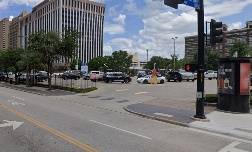 The entrance to this surface lot is located on the south side of Main St, on the southeast corner of Main St and N Lamar St. Look for the white sign "Public Parking, Bank of America Plaza Courthouse" in blue.
