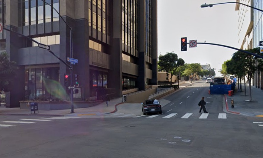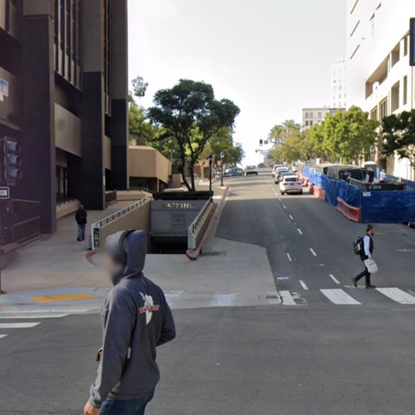 This indoor parking at the Comerica Bank building is located on the left side of 7th Ave, just after the intersection with B St. Look for a down-ramp entrance with a gray sign above the entrance that reads "600 B Street" and a metallic sign reading "Parking." This ramp is in front of a gray and brown multi-story building that reads "Mitek" in silver. The official address of this location is 600 B St.