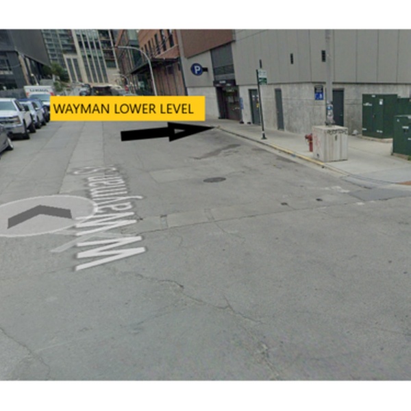 This indoor garage is located on the south side of W Wayman St, between N Peoria St and N Green St. Look for an encircled "P" in blue and white, and a black sign that reads "Public Parking" in white. The official address of this location is 832 W Fulton St. (The address of the garage entrance is 859 W Wayman St.)