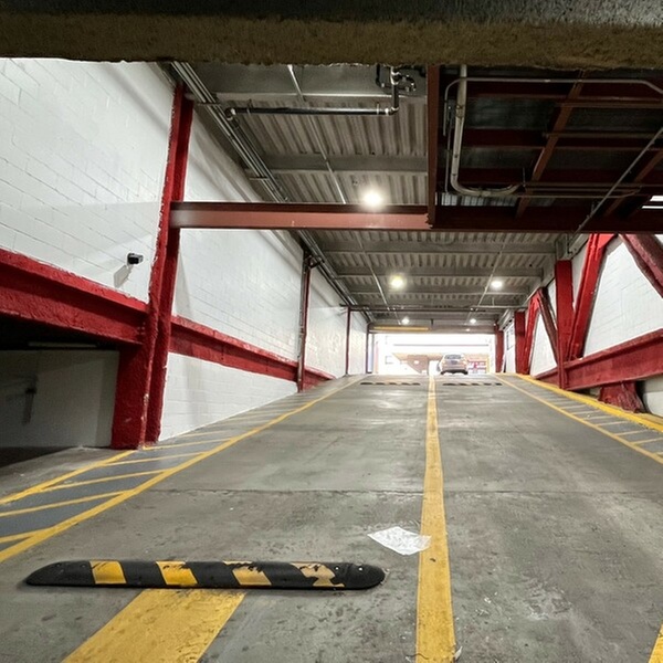 This indoor garage is located on the right side of 38th Ave, between Main St and 138th St. Look for a sign that reads "Parking" in black letters above the entrance.