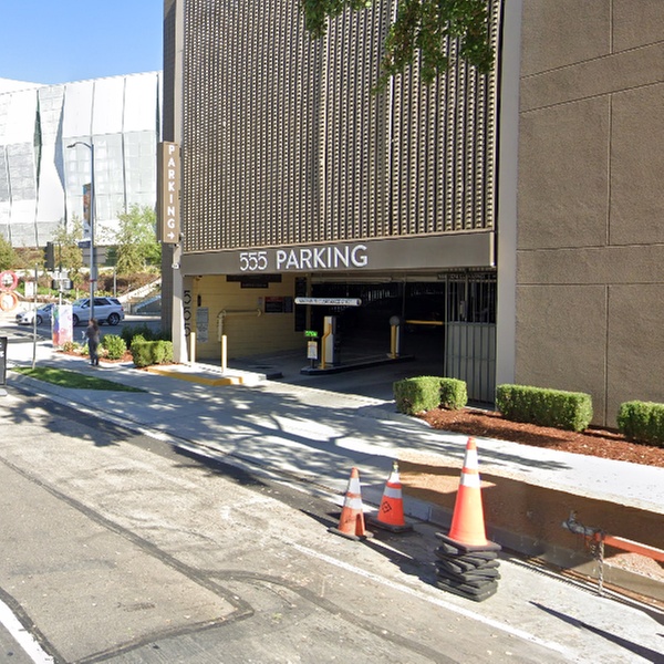 This is parking at the 555 Parking Garage located on the right side of 5th St, between Capitol Mall Rd, at the intersection of 5th St and L St. This intersection is the entrance to Golden 1 Arena. There is an additional entrance on 6th St, between Capitol Mall and L St. The official address of this building is 555 Capitol Mall. (The address of the garage entrance is 1213 5th St.)