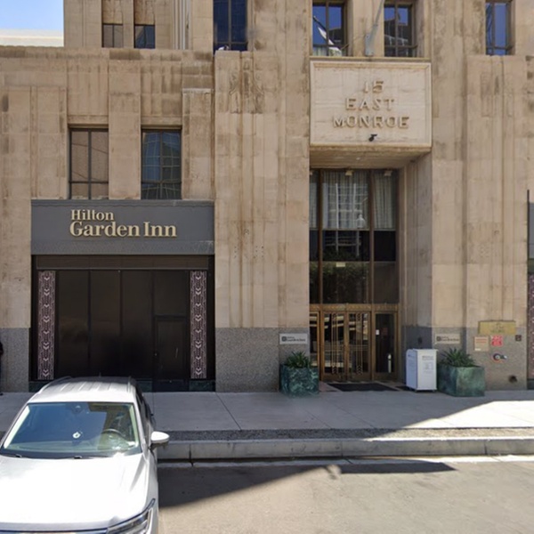 This is valet parking at the Hilton Garden Inn, located on the south side of E Monroe St, between N Central Ave and N 1st St. Look for a white traffic cones that reads "Valet only" in black. The valet kiosk is underneath an engraved sign reading "15 East Monroe" between "Hilton Garden Inn" signs.