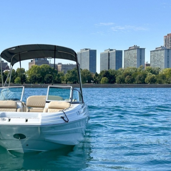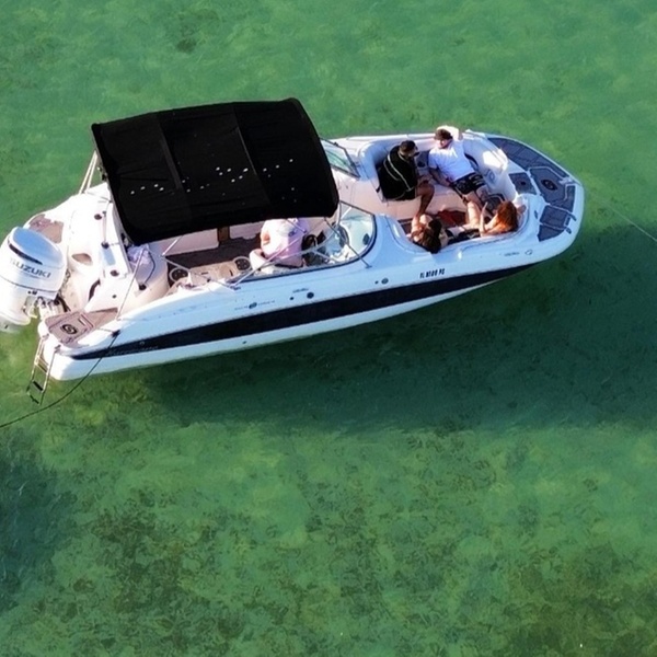 - Modern powerboats with spacious seating, shade canopies, Bluetooth stereo, cooler with ice and water