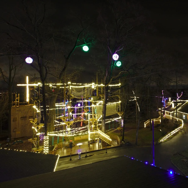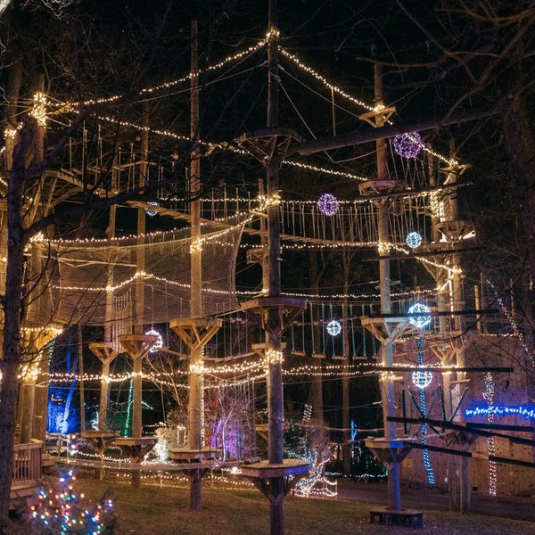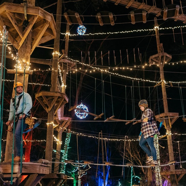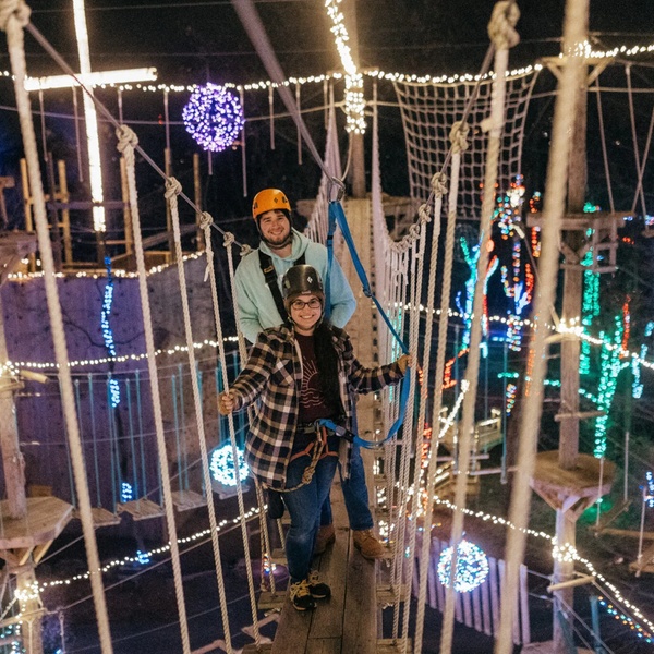 This thrilling experience combines ziplining over stunning Christmas light displays with high rope obstacles. It also includes a 35 ft. controlled descent and access to the first two levels of 33 elevated, lit obstacles.