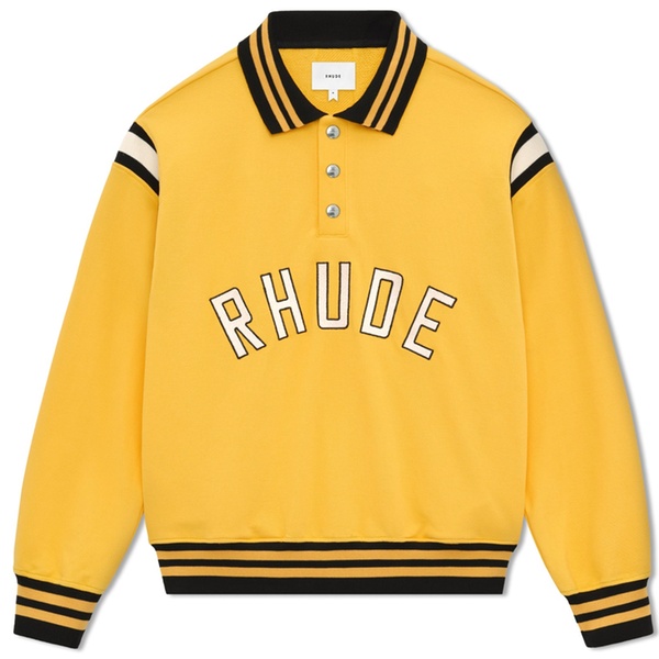 Option 5 Rhude Men's Ls Warm Up Polo — Sizes: S | M | L | XL Channeling retro athletic and varsity aesthetics, this long-sleeve polo features a bold yellow construction with striped trim on the collar, cuffs, and shoulders. The oversized "RHUDE" lettering across the chest ensures an unmistakable, vintage-inspired statement.