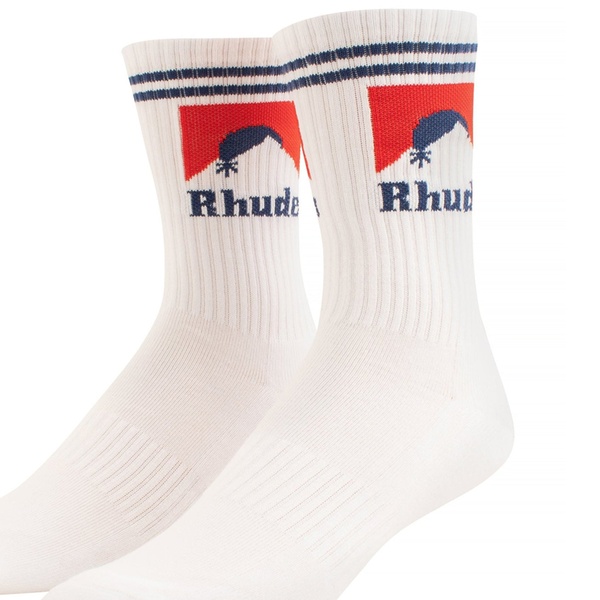 Option 1 Rhude Men's Moonlight Sock — Size: One Size An athletic-inspired sock featuring a distinctive mountain graphic and the bold "Rhude" logo in classic red, white, and blue. Made from a comfortable cotton blend, these socks add a playful, high-end detail to complete a full Rhude look.