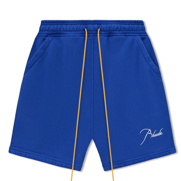 Option 4 Rhude Men's Sweatshort Vintage Cobalt Blue — Sizes: L | XL | XXL Crafted for comfort with a tailored fit, these shorts feature a vibrant Cobalt Blue finish and an extended, contrast drawstring. The minimalist design is subtly elevated by the brand's signature script logo embroidered near the hem.