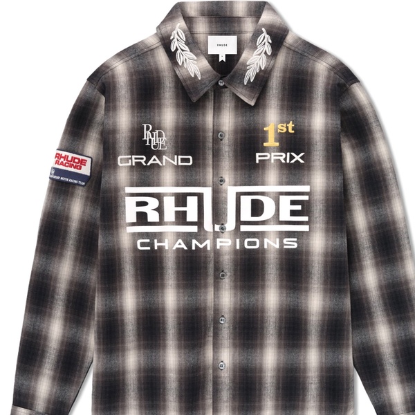 Option 6 Rhude Men's Racing Flannel — Sizes: M | L | XL This piece perfectly fuses luxury casualwear with bold motorsport graphics and patches on a soft, classic flannel base. The elaborate embroidery and large-scale "RHUDE CHAMPIONS" print transform the traditional plaid into a high-fashion statement jacket.