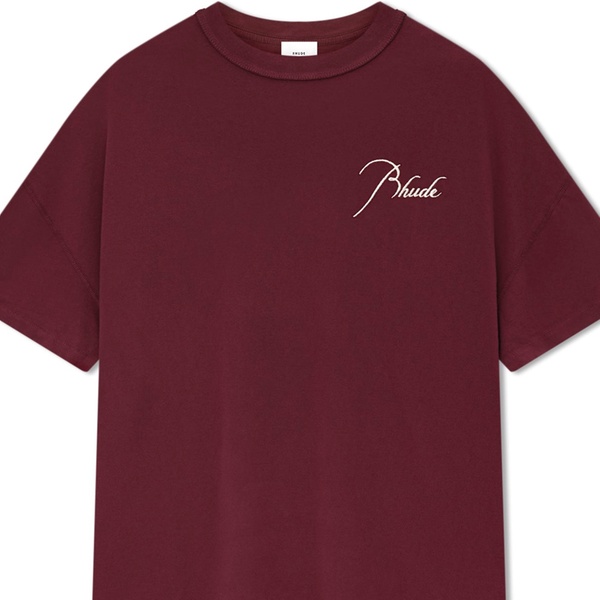 Option 2 Rhude Men's Reverse Tee Burgundy — Size: S This essential tee is elevated by Rhude's signature reverse terry construction and an intentionally oversized, relaxed drop-shoulder fit. The deep burgundy shade provides a luxurious base for the simple, elegant cursive logo on the chest.