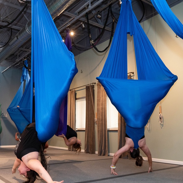 Float gracefully and build core strength in an Aerial Hammock Foundations class, discovering fluidity and balance.