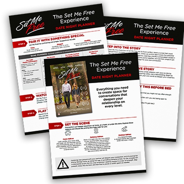 The Set Me Free At-Home Date Night Movie Experience is a film-inspired, digital date night kit for couples designed to bring laughter, deepen connection, and create memorable evenings through an exclusive indie film, a guided conversation game, and interactive script replays.