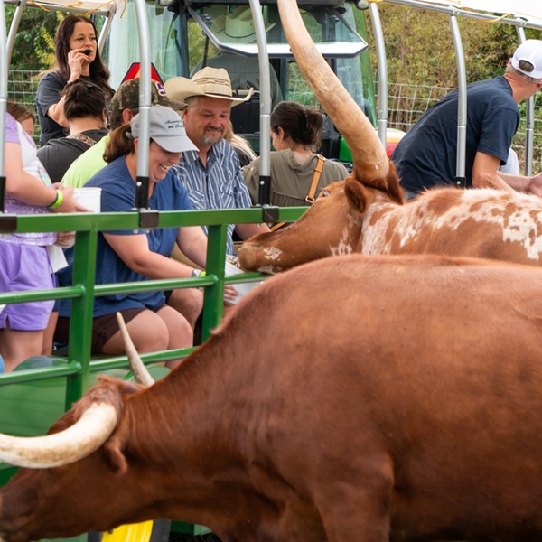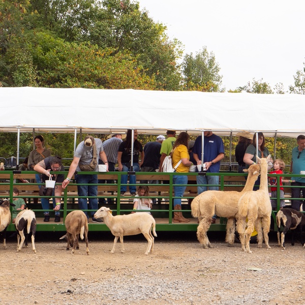 The Safari Hayride offers an up-close look at a variety of ranch animals, including llamas, donkeys, alpacas, longhorns, highland cows, sheep, goats, fallow deer, sika deer, and more.