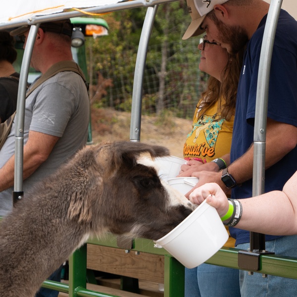 It’s ALL ABOARD one of our covered wagons pulled by John Deere Tractors. This Safari Hayride Adventure is a family-friendly adventure that allows guests to have an up-close and personal look into the life of our ranch animals. Nestled within the 100-acre farm, you’ll get to visit many of our animals including llamas, donkeys, alpacas, longhorns, highland cows, sheep, goats, fallow and sika deer, and more!
