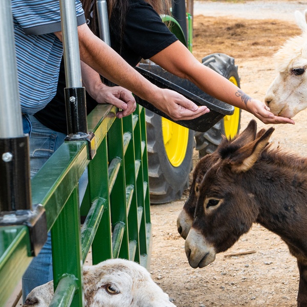 This covered wagon experience gives guests opportunities to feed, pet, capture great photos, and be in close proximity with the animals. As the animals allow. We do not force animals to interact. You can even combine with SkyLand Ranch attractions including Wild Stallion Mountain Coaster and/or the General Admission with Scenic Chairlift to Skyland Ranch which features the new WagonWheeler Swing Tower, miniature animal encounters, live entertainment, and dining options (additional purchase may be required).