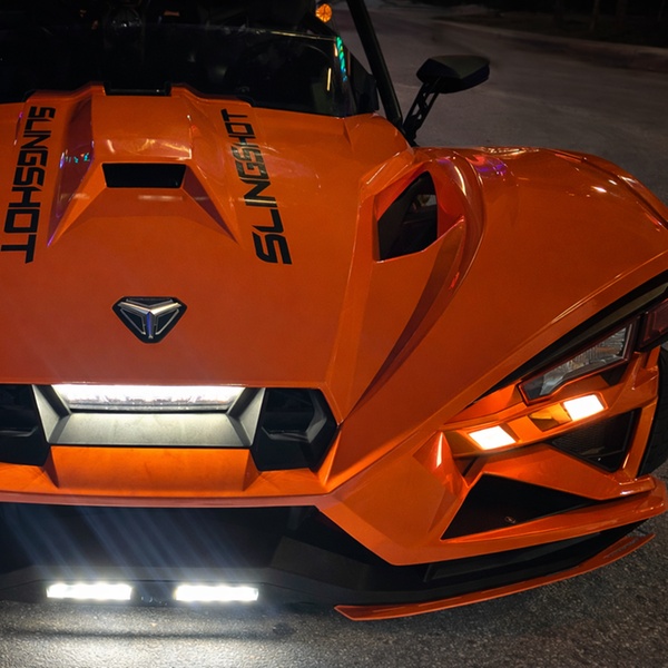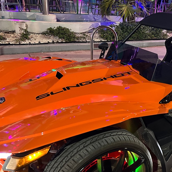 Each ride is a private, open-air experience for up to three guests in a custom 4-seat Slingshot, driven by a professional representative.