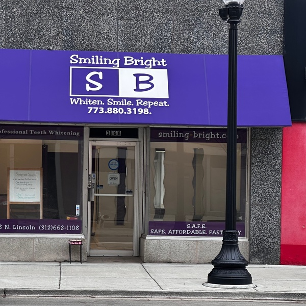 Smiling Bright is a teeth whitening studio that has whitened smiles across the Chicagoland area for over 15 years. Cool gray walls and soothing purple ceilings envelop Smiling Bright's interior where you will relax in a private, curtain drawn treatment room. Couples rooms are also an option for family and friends that want to experience teeth whitening together. Our in-office sessions use a hydrogen peroxide based whitening formula and LED blue light technology to coax out stains from the surface of your teeth as well as stains deeper in the bone of your teeth. We believe that your smile can be one of your greatest attributes. Smiling Bright does not provide any dental services because we are not dentists. Come see us to get your whiter, brighter smile today!