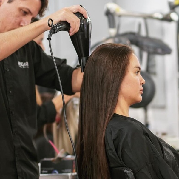Experienced hairstylist performs a blowout treatment to help customers enjoy shining, smooth, and sleek strands
