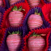 • 1 Dozen Regular Chocolate Covered Strawberries with Pink and Red Chocolate Stripes, 1 Nonpareils Strawberry with Message