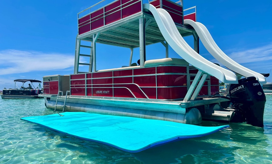 Explore Destin's Crab Island and Emerald Coast waters with luxury pontoon rentals and thrilling motorized surfboards.