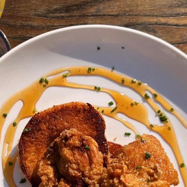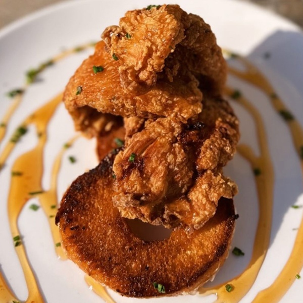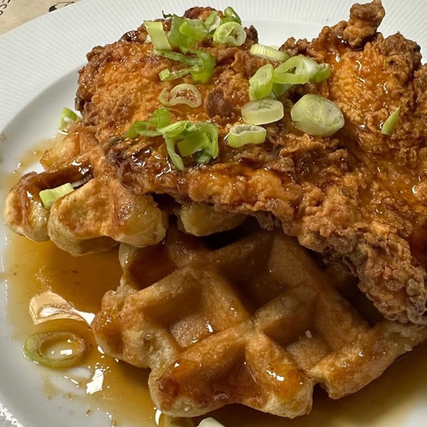 - Chicken & Waffles – Buttermilk chicken, Belgian waffles, maple chili syrup