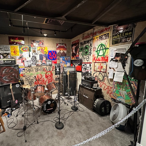 Play the actual guitars and basses from bands like Rise Against, NOFX, and Pennywise in the guitar room