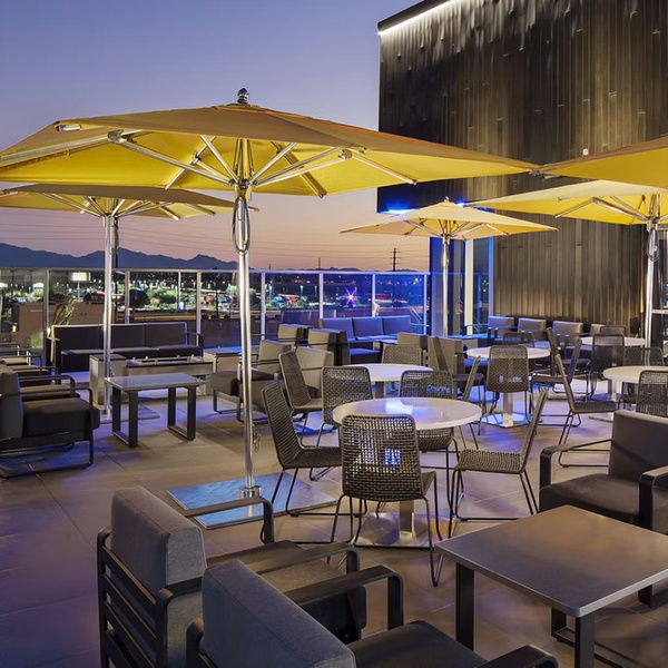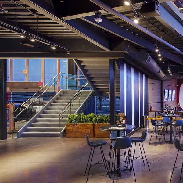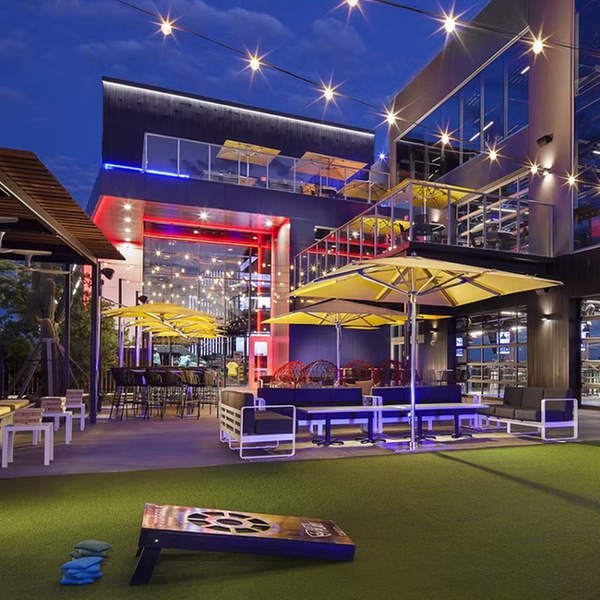 Three floors of entertainment with 90+ bays, rooftop fire pits, a 36-foot video wall 200+ HDTVs & free -Wi-Fi