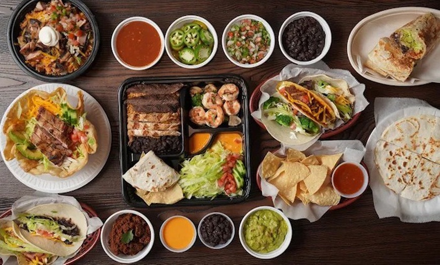 • Choice of Burrito: Chicken, Skirt Steak, Chicken & Skirt Steak, Shrimp, Chef Burrito, Tex-Mex Chili, Black Bean (V), Steamed Veggie (V)
