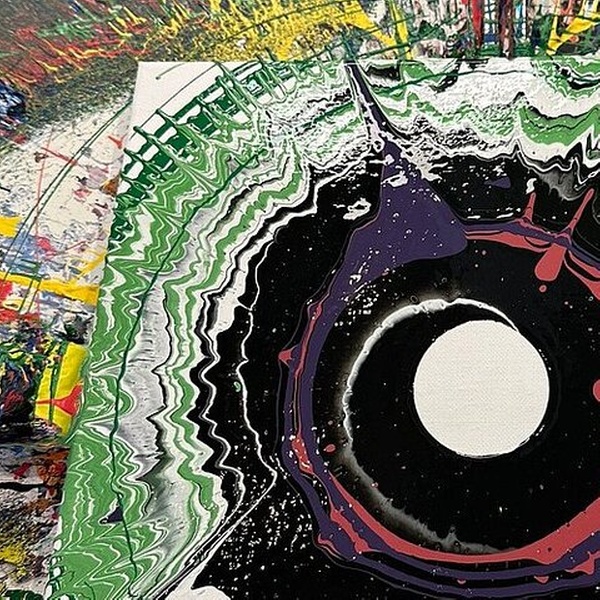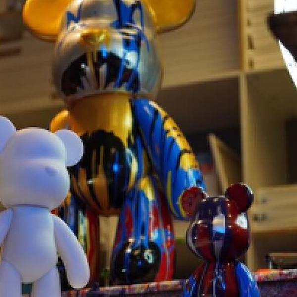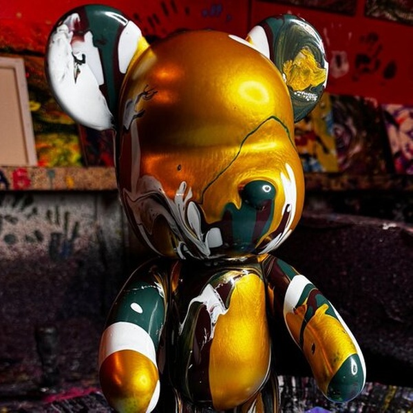 - All materials: bear, glossy paints, spin art machines, and canvas.