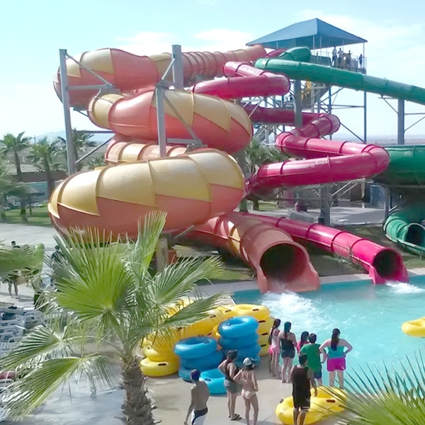 Waylon's Water World offers a wide range of attractions including the Multi-Lane Mat Racer, Lazy River, Constructor, Red Racer & Super Bowl Water Slides, and a Toddler Pool.